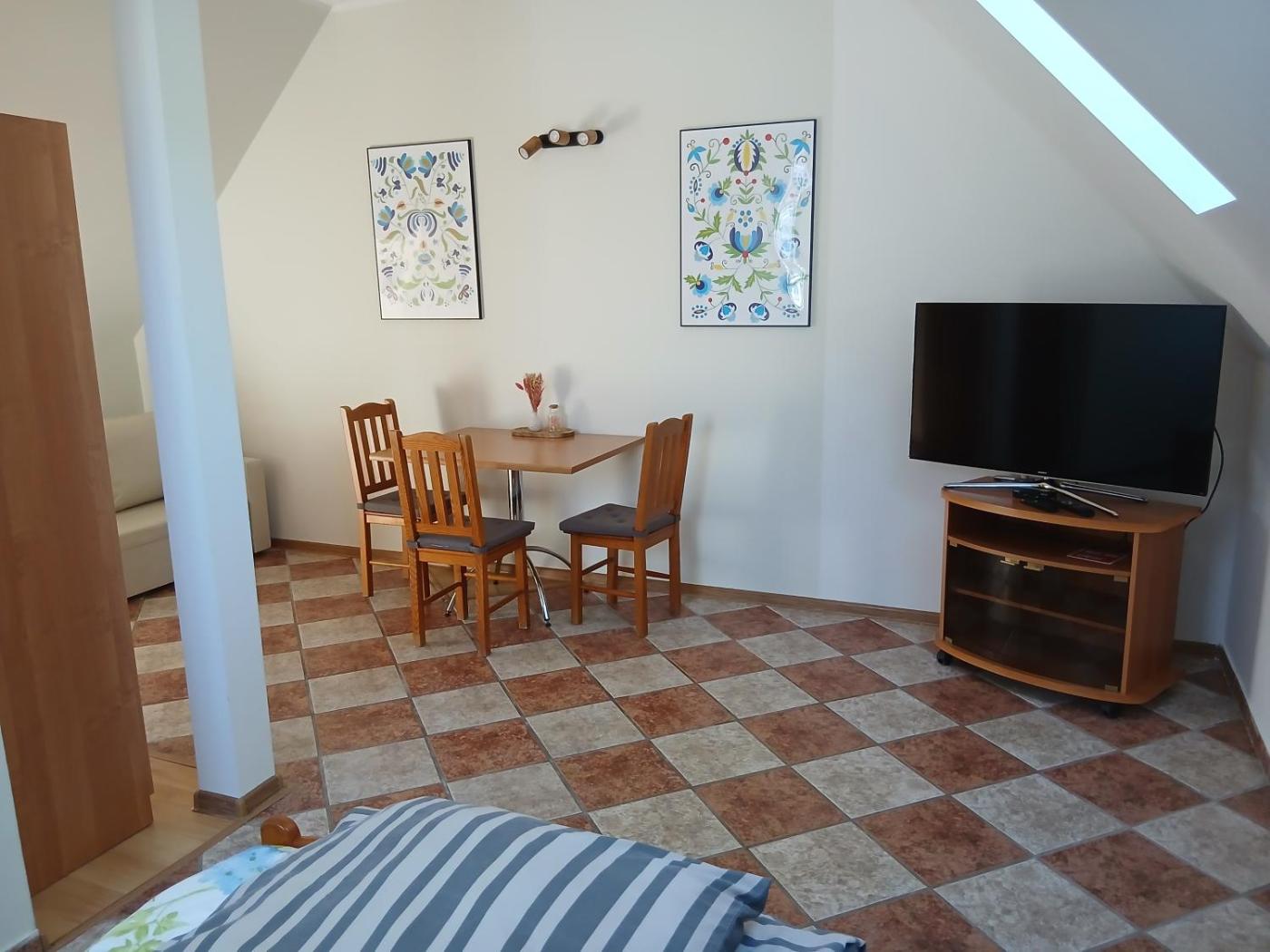 Pokój czteroosobowy z widokiem na ogród. In the kitchenette, guests will find a stovetop, a refrigerator, kitchenware and an electric kettle. The quadruple room offers air conditioning, a dining area, a terrace with garden views as well as a private bathroom featuring a shower. The unit offers 2 beds. Pokój Czteroosobowy - 4 osobowy. Powierzchnia pokoju ok.: 26 mkw. ;